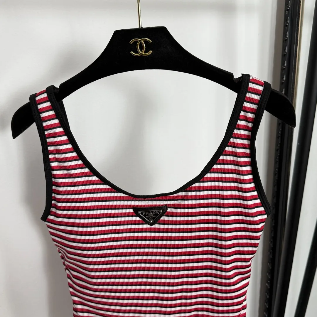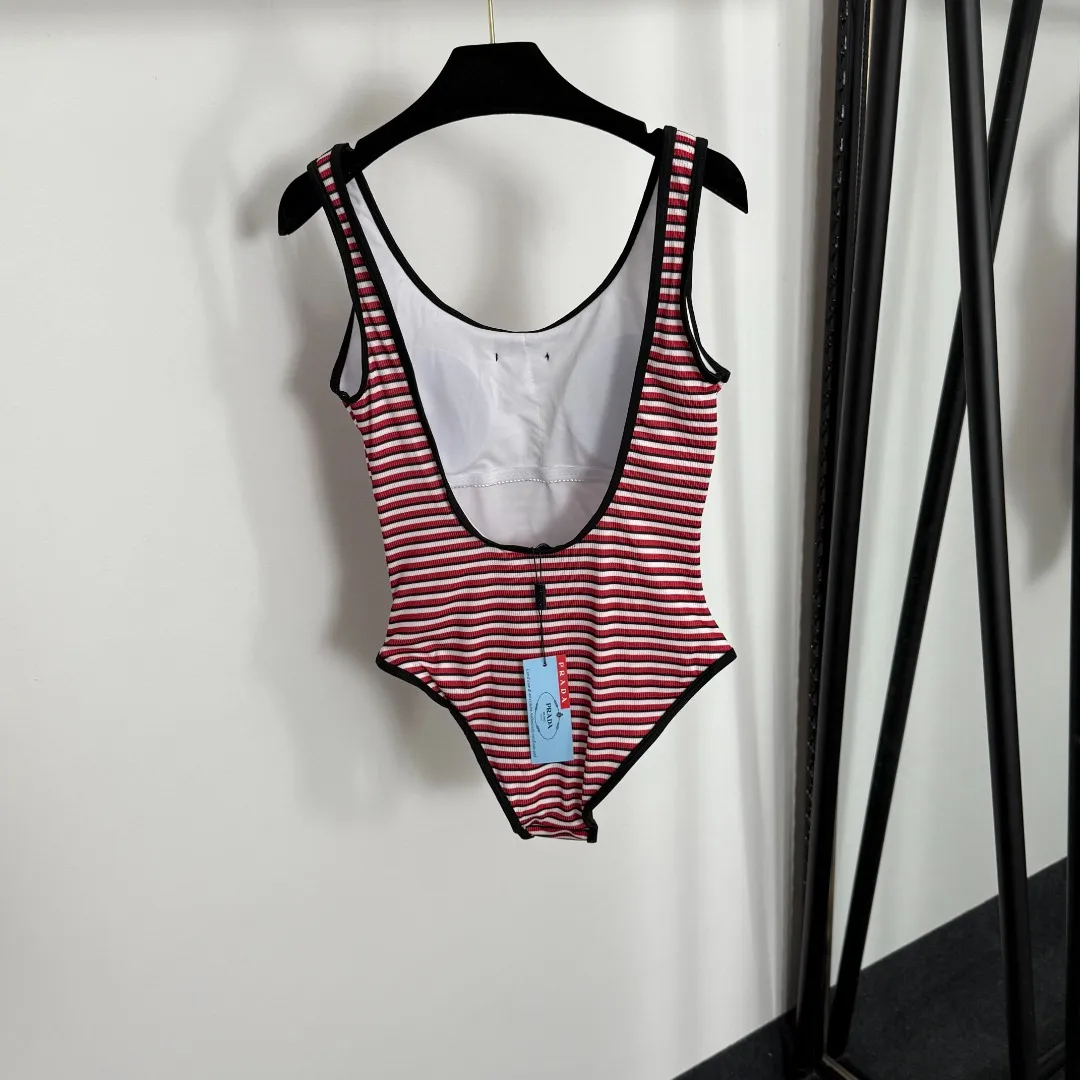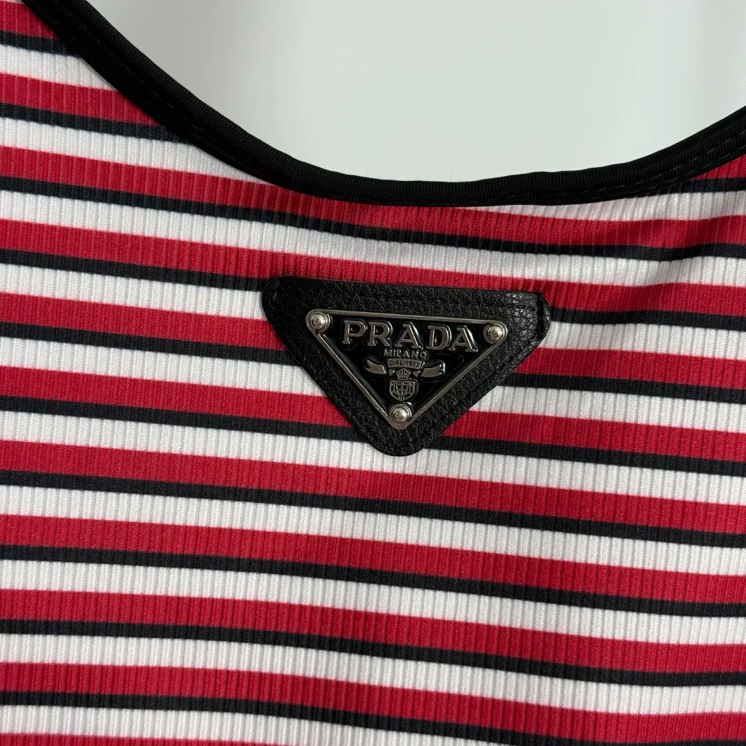 Prada新款ロゴ三角マーク赤色ストライプワンピース水着