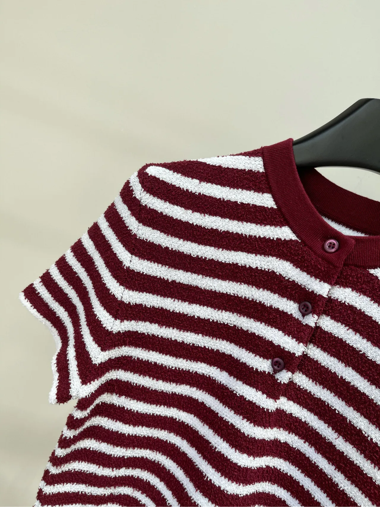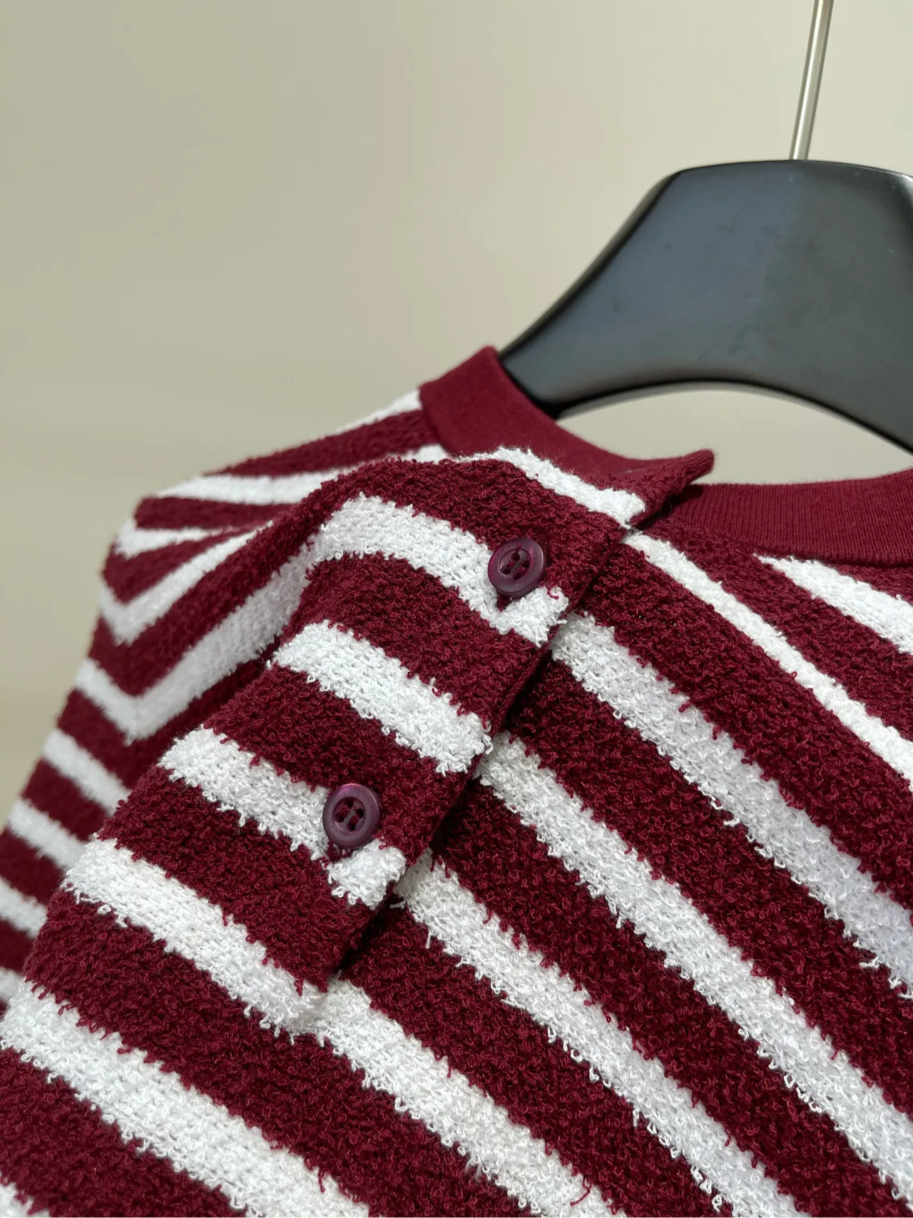 プラダの2023年春夏新作、ワインレッドと白のストライプが特徴的な半袖Tシャツです。高品質な綿とナイロンの混紡素材を使用し、インポート糸で柔らかく通気性が良いです。カスタムボタンとクラシックなシルエットがスリムに見せ、エレガントで合わせやすいデザインです。白肌を引き立てる色合いが魅力のこのTシャツ スーパーコピーは、特別な一着となるでしょう。
