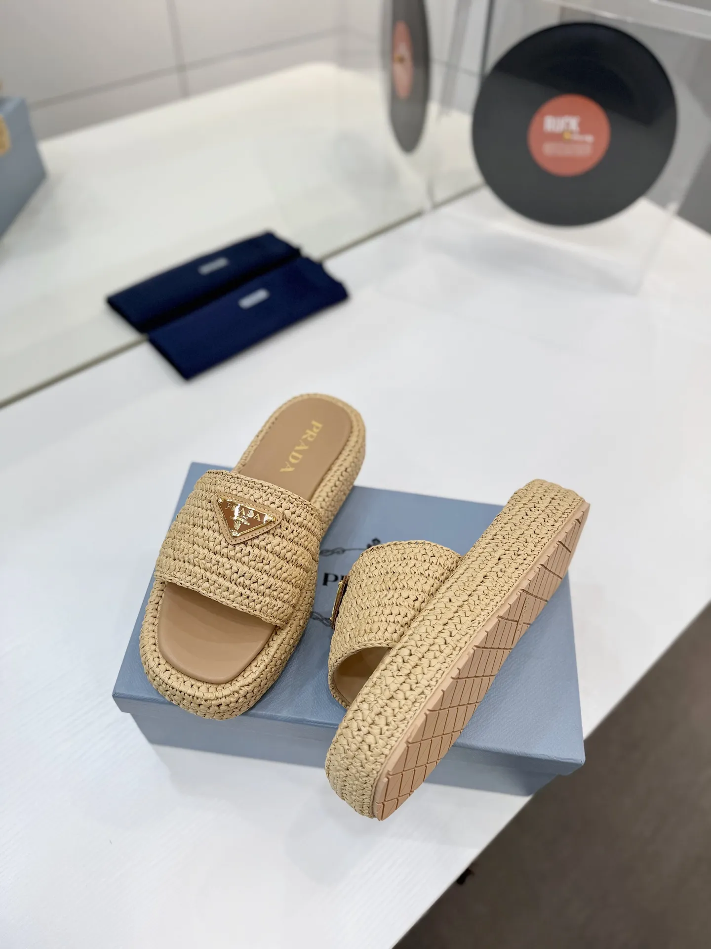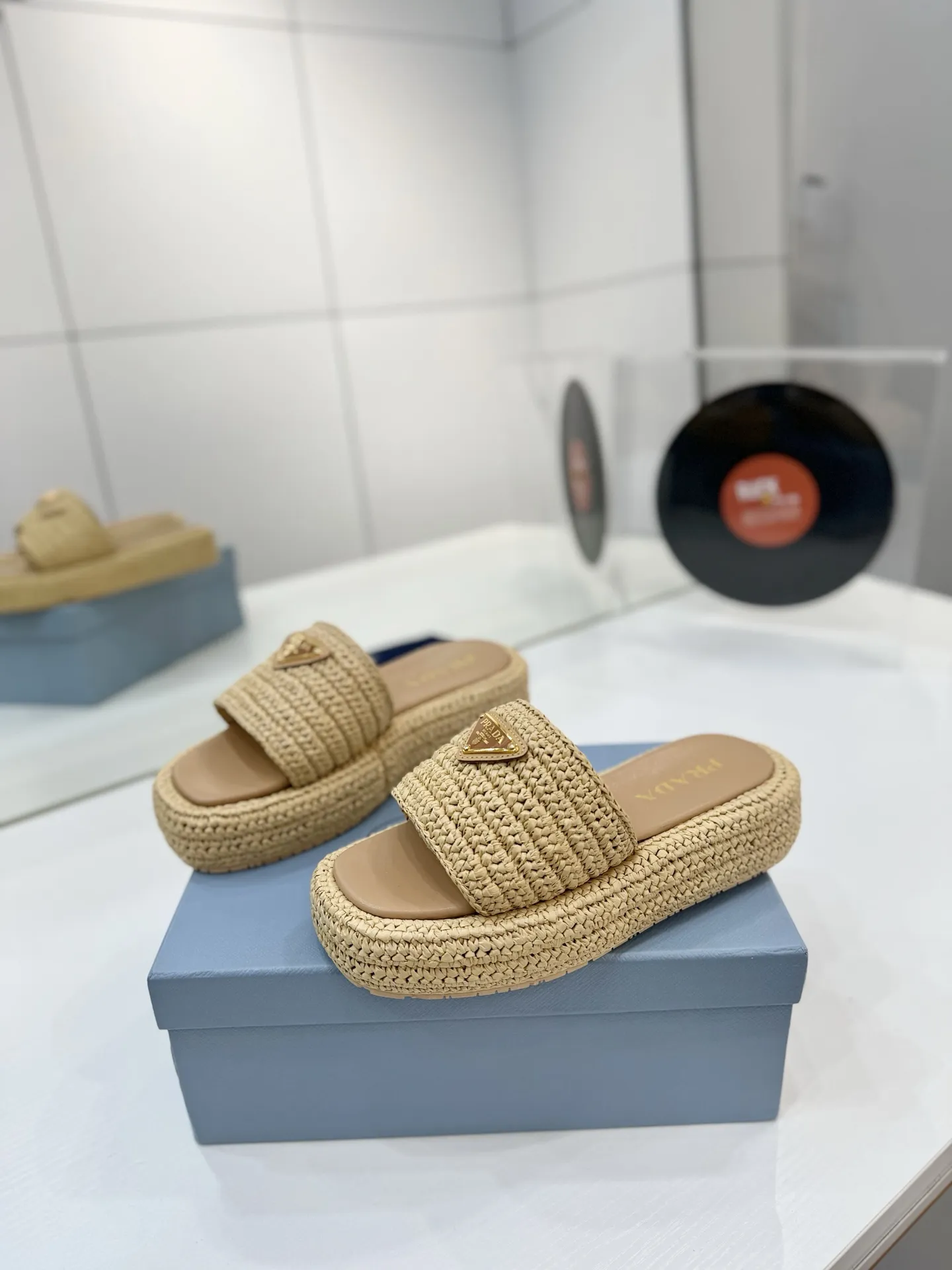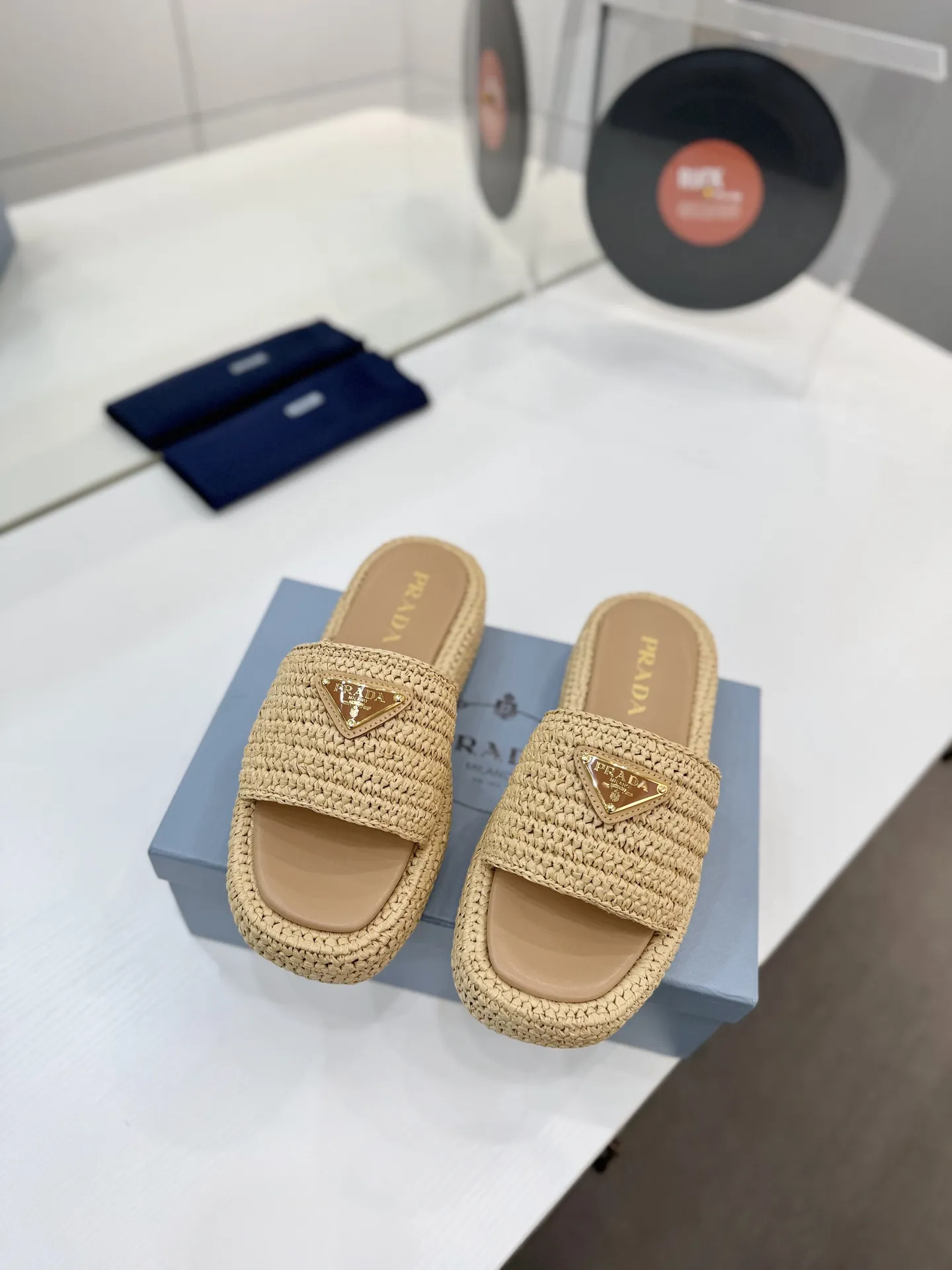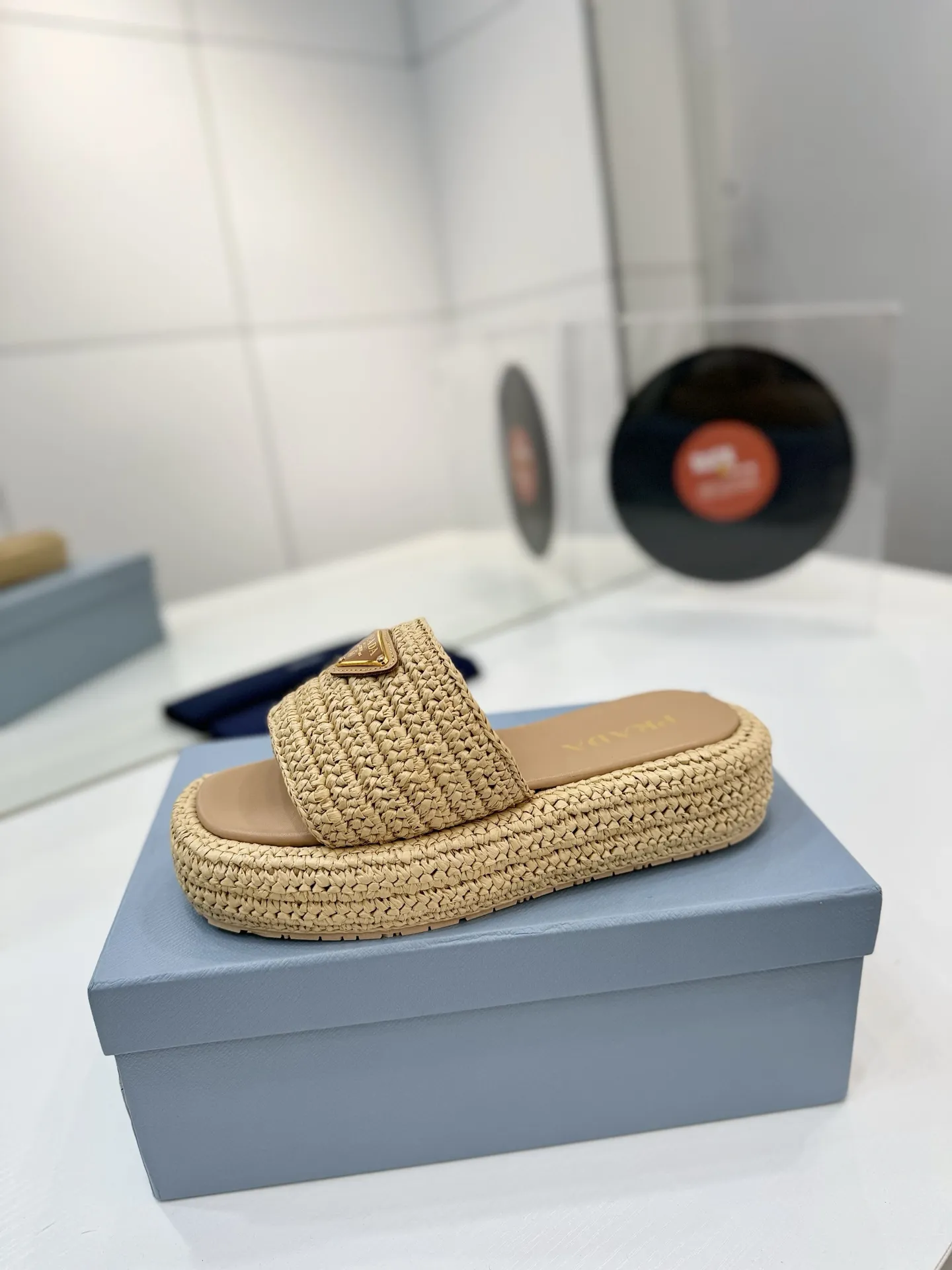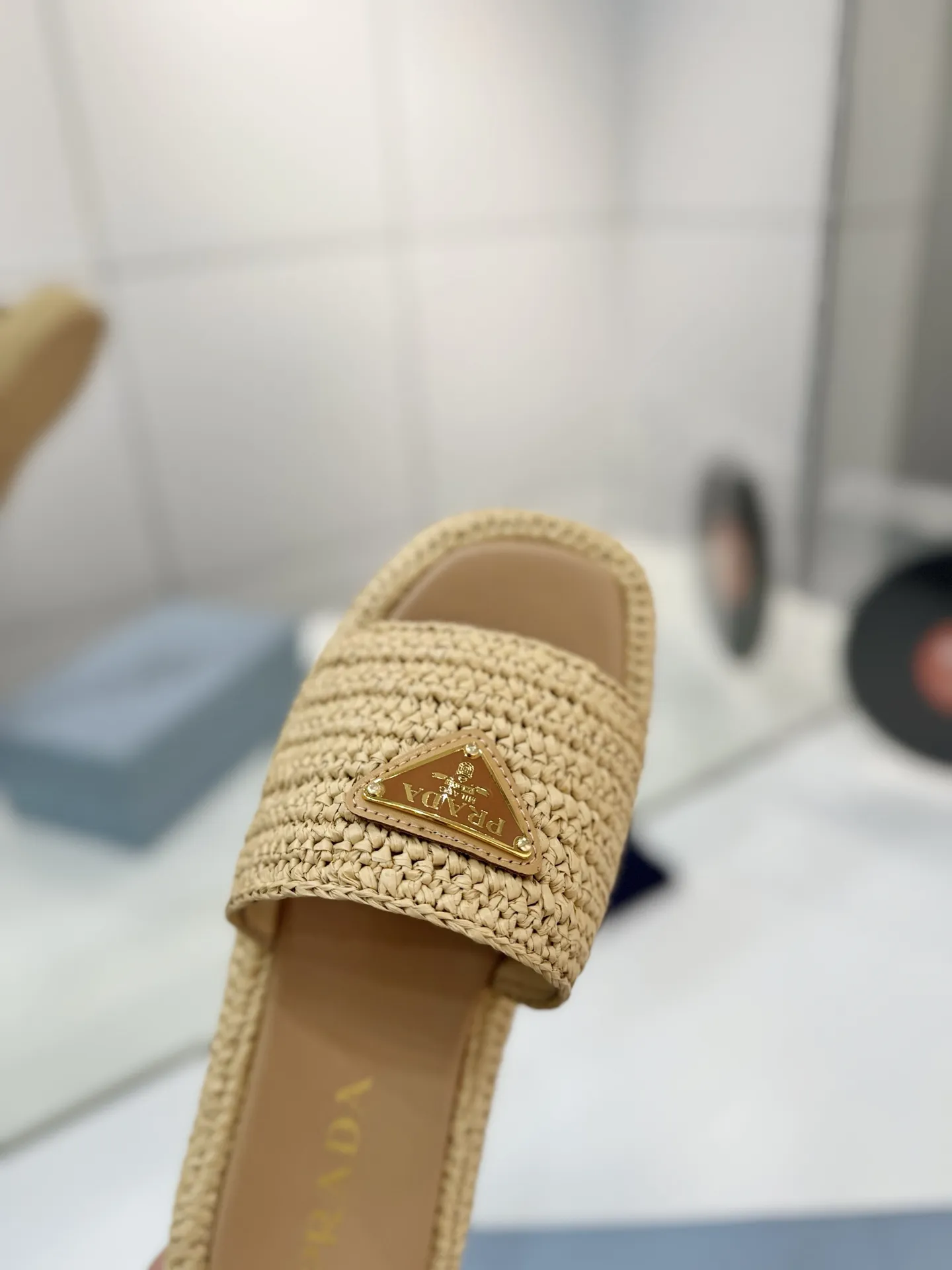 プラダ新作わら編みフラットサンダルベージュ