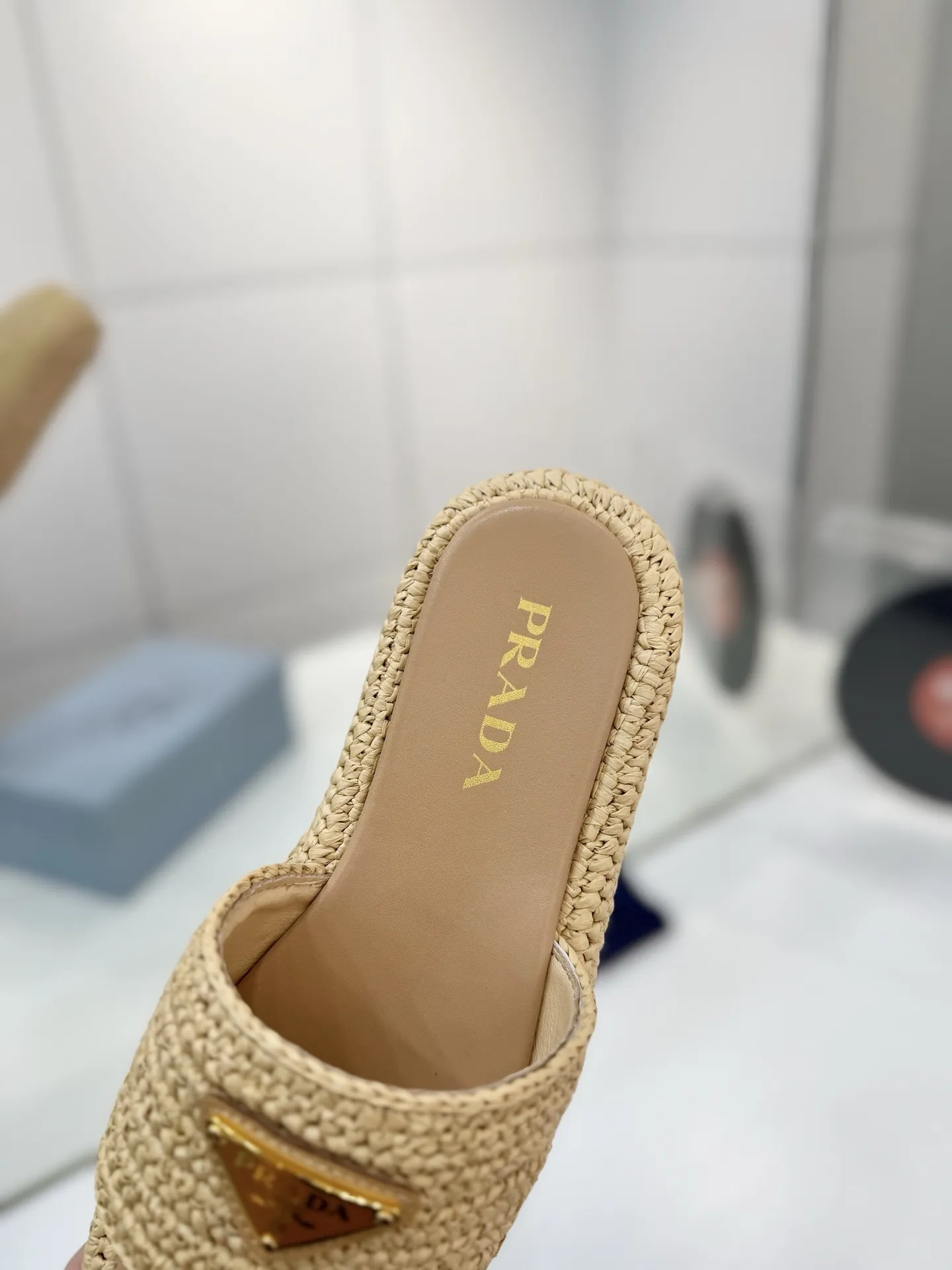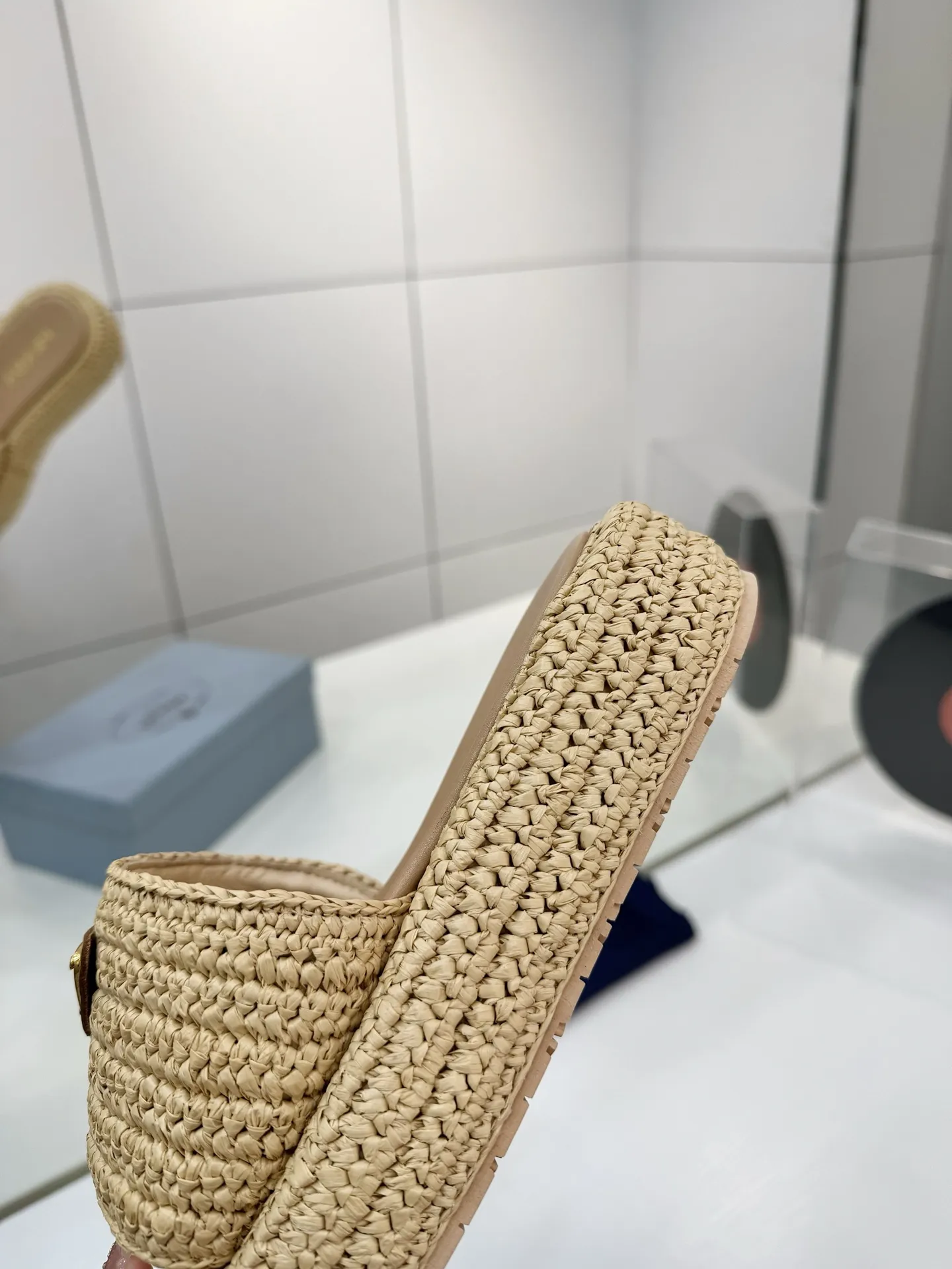 プラダ新作ベージュわら編みフラットサンダル