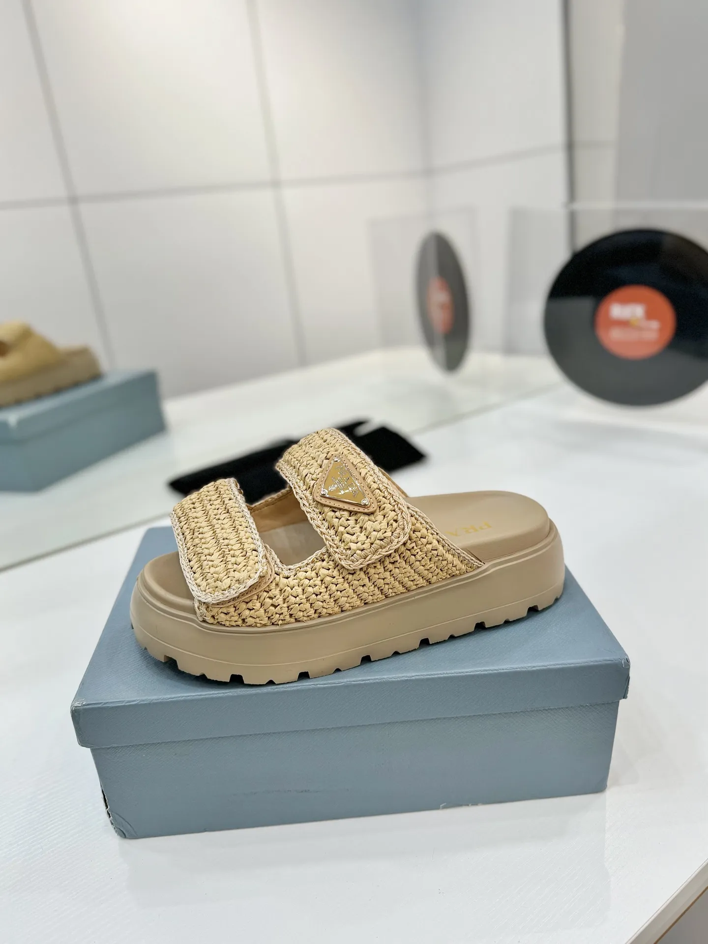 プラダ新作わら編みサンダルベージュフラット