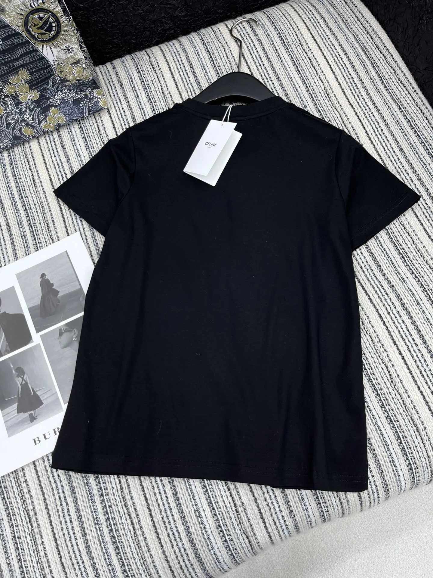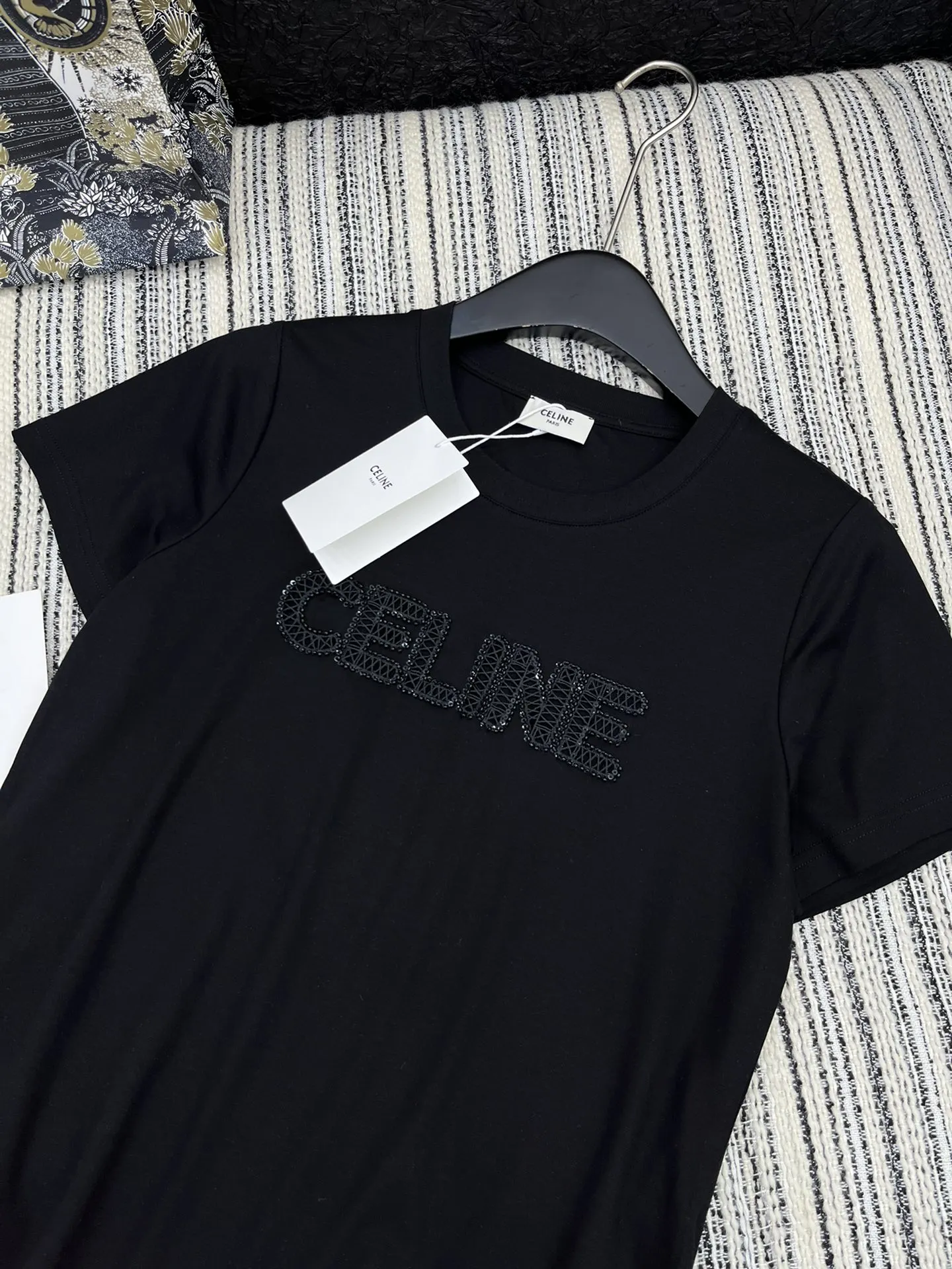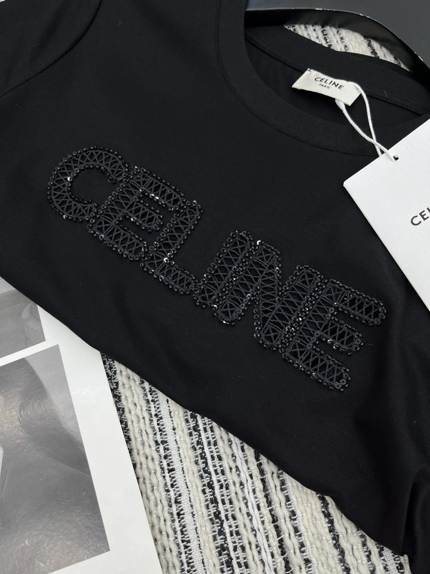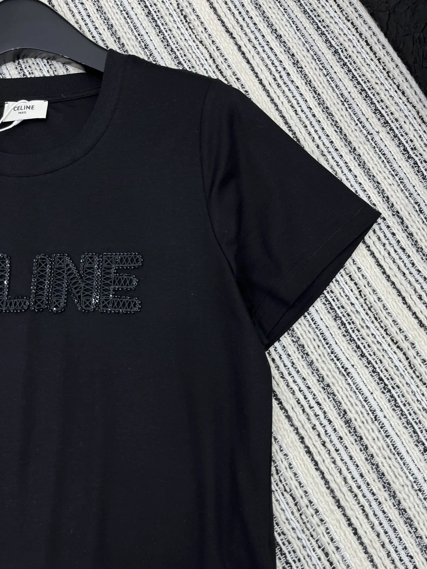 セリーヌ新作黒半袖Tシャツ刺繍デザイン