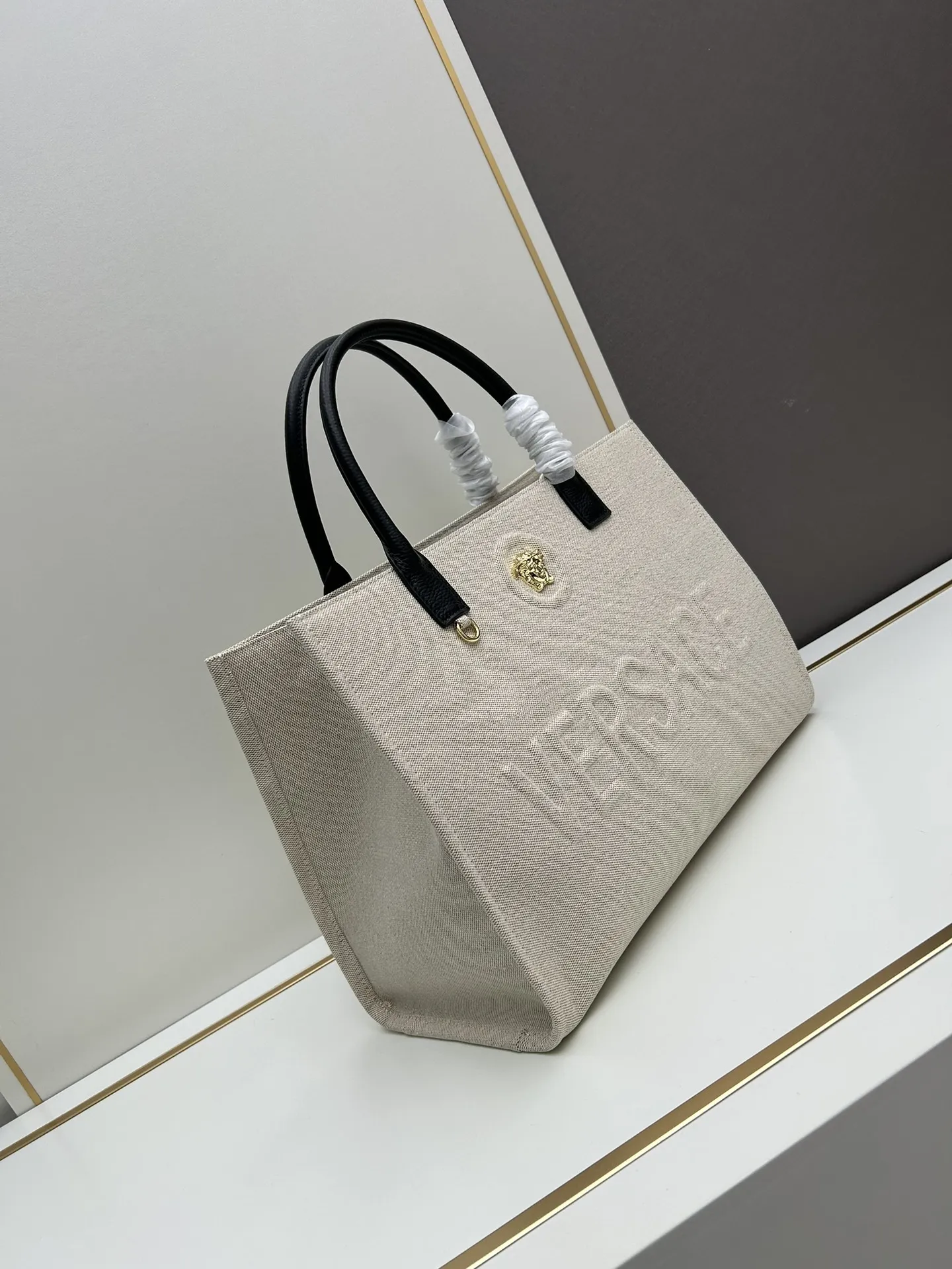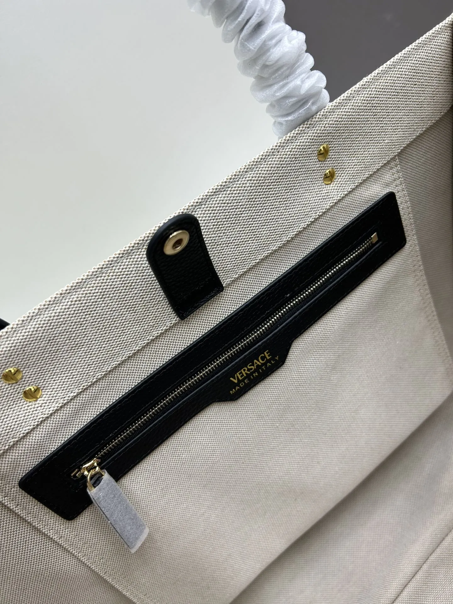Versaceの2023秋冬新作、ホワイトの牛仔トートバッグです。開模プレスレタリングが施され、手提げ部分は牛革風、ボディはデニムキャンバス素材で軽量かつお手入れ簡単。ファッショナブルなデニム素材とVersaceのクラシック要素が融合したデザインが魅力です。サイズは40x16x29cmで、普段使いにも最適なアイテムとして、N級品をお探しの方にもおすすめです。