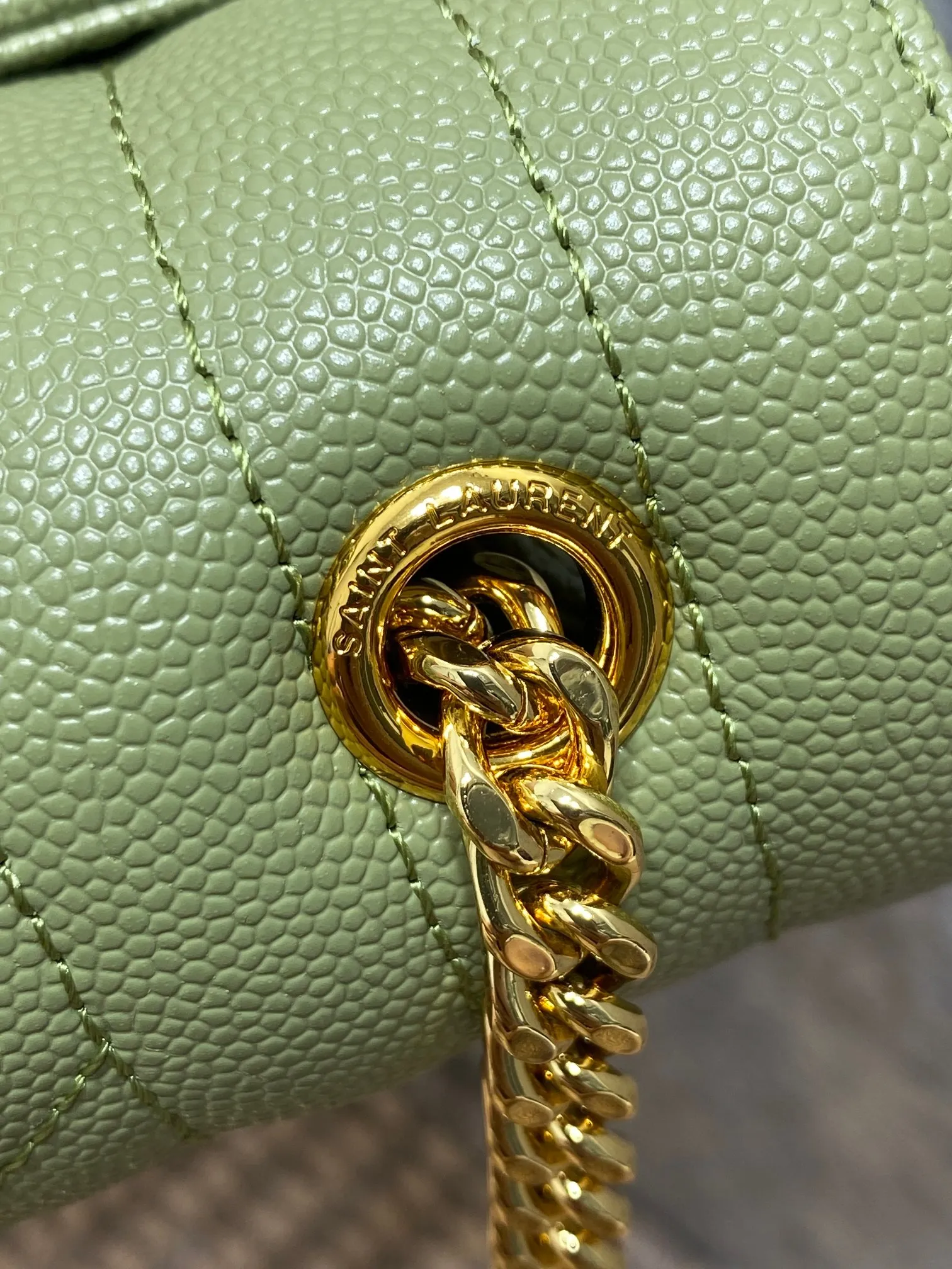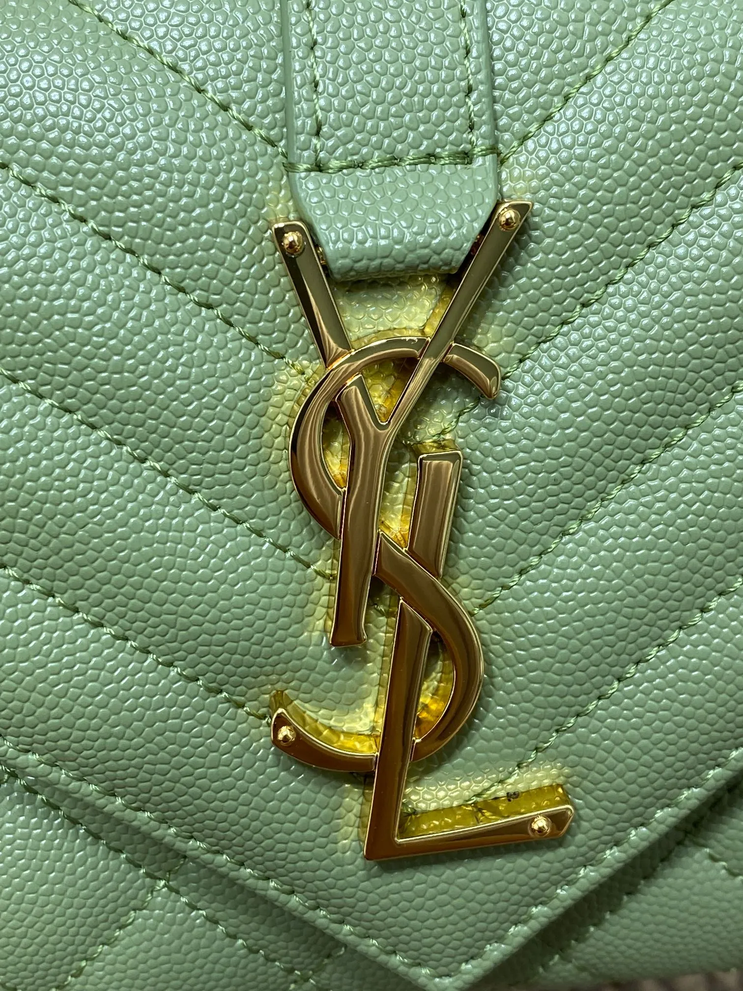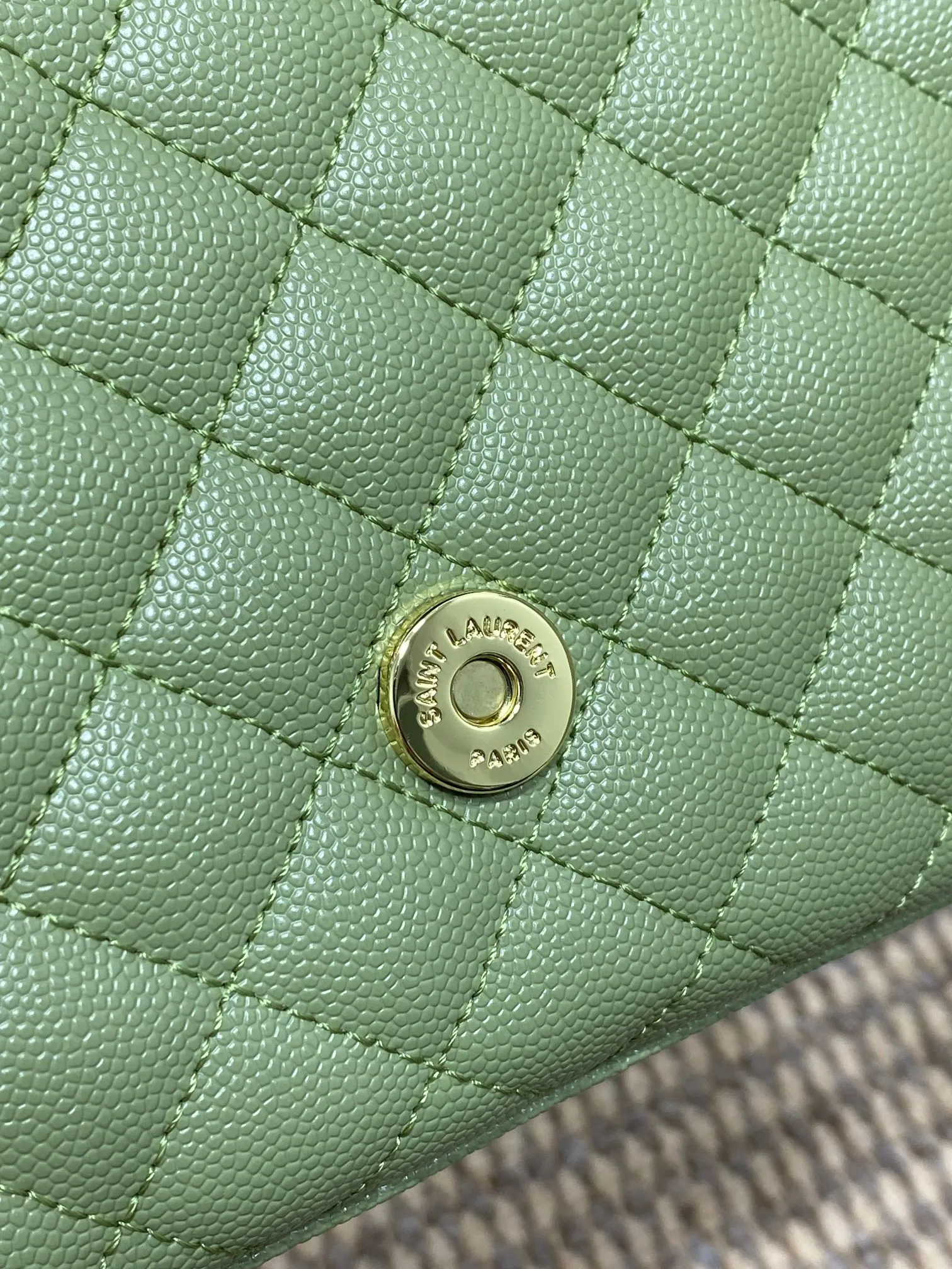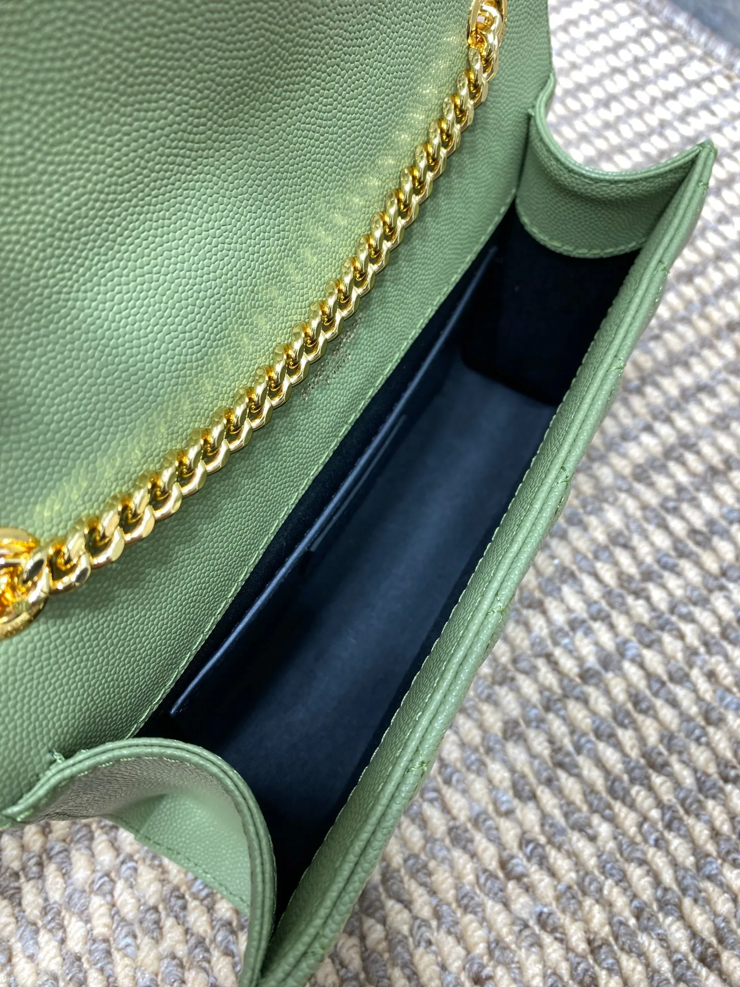 イヴサンローランの新作小型レターパックです。グリーンの真皮球紋デザインが特徴で、ポリッシュゴールドの金具が高級感を演出します。チェーンショルダーストラップとフリップカバーが付いており、カードや小物の収納に便利です。サイズは21x13x6cmで、コンパクトながらも機能的です。特別なデザインをお探しの方には、N級品としても注目されるアイテムです。