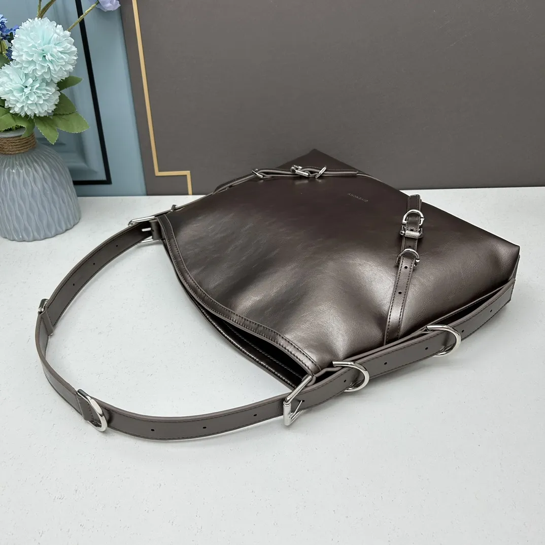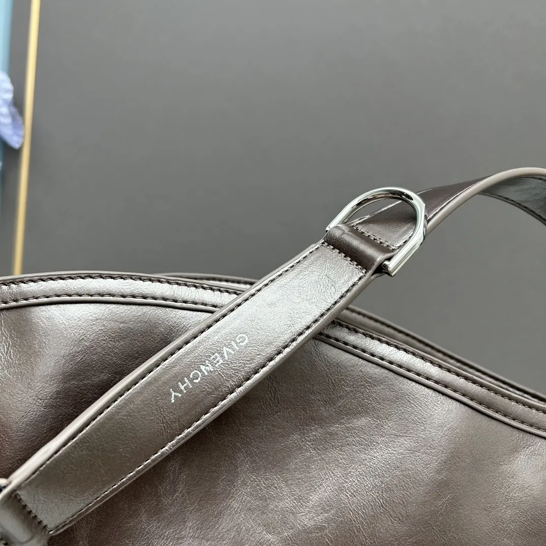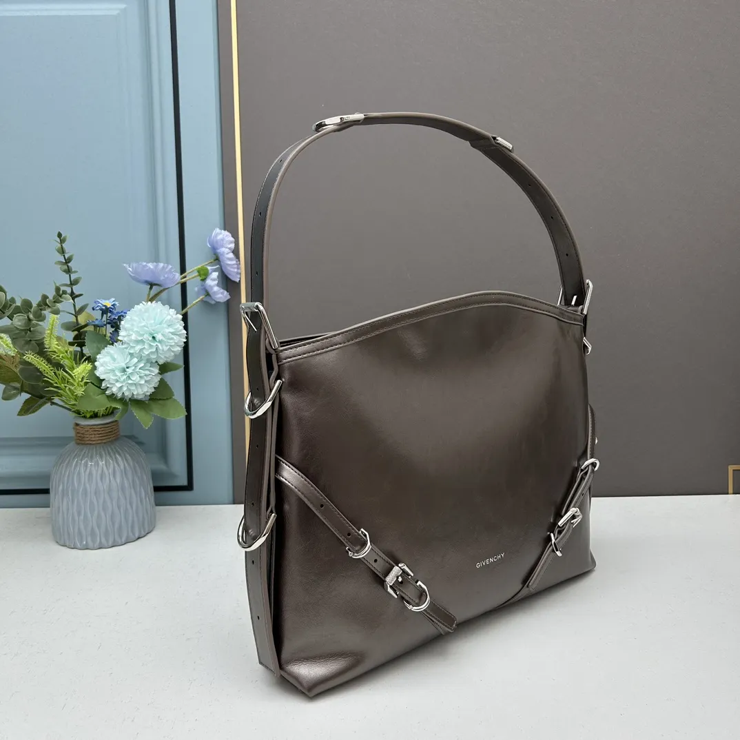 ジバンシィのVoyouシリーズから、ブラウンのレザーショルダーバッグが登場。レトロでクール、リラックス感がありながらも実用的なデザインが魅力です。軽度鞣制の牛革を使用し、V形の輪郭が特徴的。調節可能なショルダーストラップで、手持ちや肩掛け、斜め掛けが可能。メタルバックルには高品質な仕上げが施されており、N級品のような精巧なディテールが際立ちます。