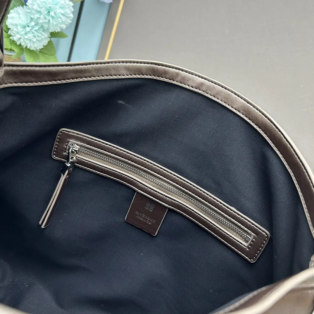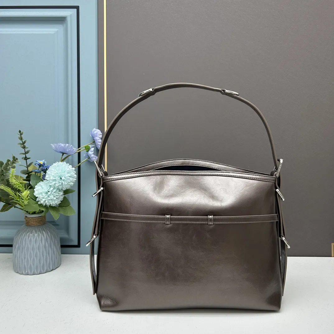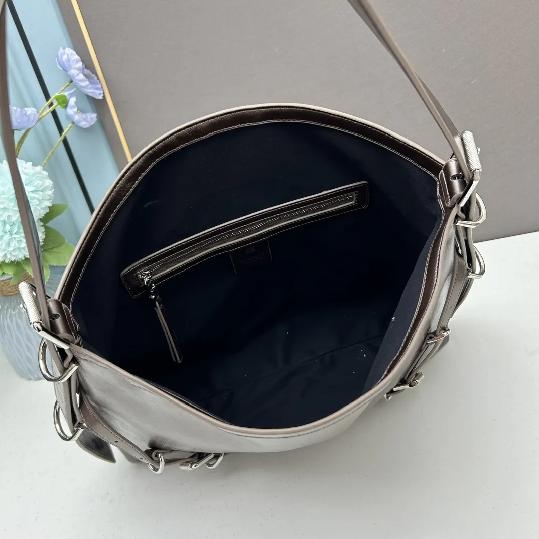 ジバンシィのVoyouシリーズから、ブラウンのレザーショルダーバッグが登場。レトロでクール、リラックス感がありながらも実用的なデザインが魅力です。軽度鞣制の牛革を使用し、V形の輪郭が特徴的。調節可能なショルダーストラップで、手持ちや肩掛け、斜め掛けが可能。メタルバックルには高品質な仕上げが施されており、N級品のような精巧なディテールが際立ちます。